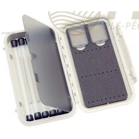 La Boite TubeFly, est spécialement conçu pour accueillir et protéger vos tubefly. Elle est dotée de 6 tubes sur un côté permettant de ranger vos mouches tout en les préservant des chocs et de l'usure. De l'autre côté la boite dispose d'une mousse dotée de fentes et de 2 compartiment de rangement, dédier au stockage de vos hameçons ou petit indicateur.