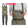 Le waders est fabriqué à partir de polyester imperméable respirant et confortable avec 3 couches sur le niveau supérieur et 4 couches au niveau inférieur. Pour vous réchauffer les mains, le waders possède une poche doublée polaire, avec une poche à glissière sur le dessus et un patch de mouche intégré. Le waders est doté d'une boucle de ceinture arrière simple avec une bande de roulement élastique de 38mm. Les guêtres anti-gravier sont intégrées ainsi que des chaussons en néoprène de conception anatomique avec une finition anti-microbienne.
